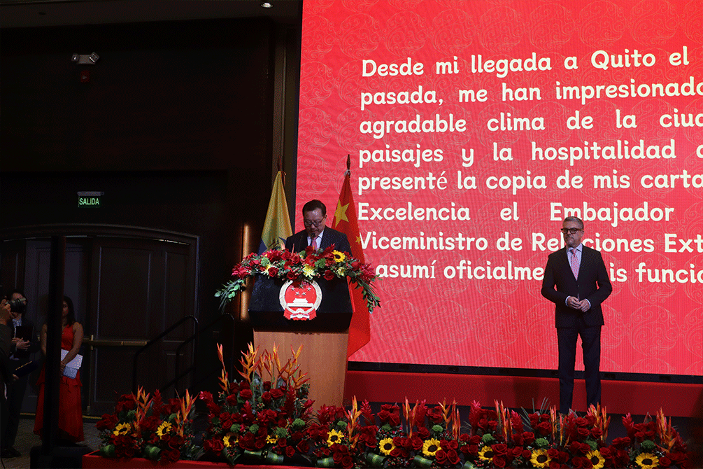 El acto estuvo presidido por el nuevo embajador de China en Ecuador, Sun Xiangyang, quien asumió recientemente sus funciones y destacó en su intervención los logros alcanzados por su país en las últimas siete décadas, así como la importancia de estrechar aún más los lazos con Ecuador.
